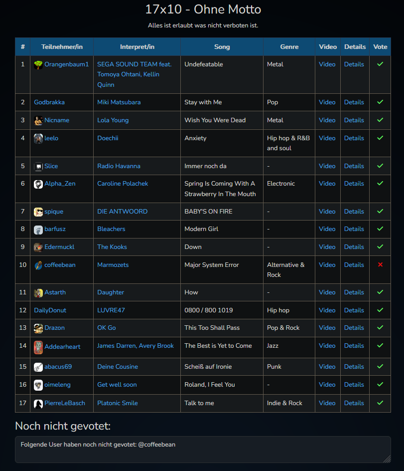 @Ziagl Es scheint etwas mit dem Abstimm-Tool nicht ganz zu funktionieren. Wenn ich die Playlist öffne, sind bereits Punkte vergeben. Und wenn ich mir anschaue, wer schon alles abgestimmt hat, scheint dies auch nicht ganz zu stimmen.