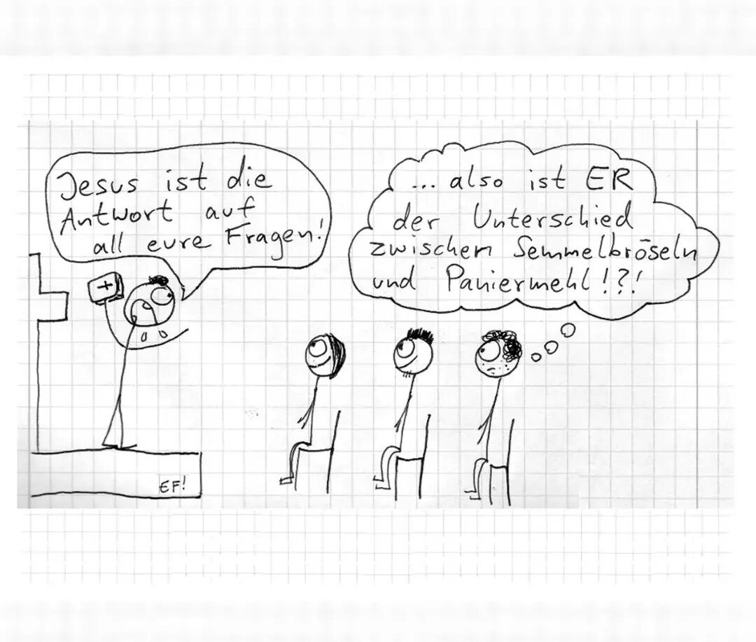 Und warum gibt’s in der Kirche dann keine Quarkspeise sondern nur so ein blödes trockenes Esspapier? Könnten ja wenigstens einen Klecks Quark mit Marmelade drauf tun. Verdammte geizige Christen. ![]()