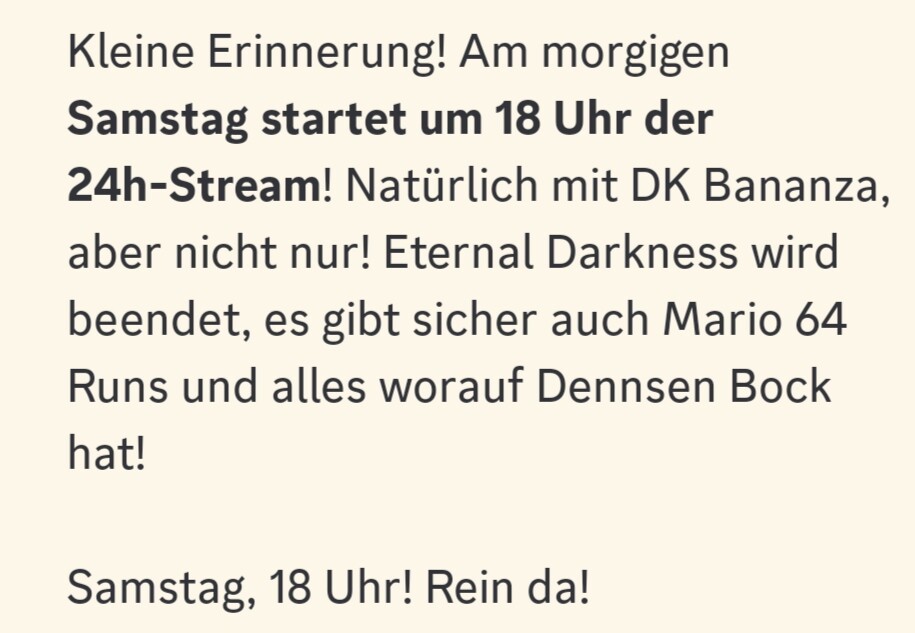 Mal gucken, ob der Fluch des 24h Streams diesmal gebrochen wird. Ich hatte in zwei oder so reingeguckt die letzten Monate. Einmal wurde er krank, ein anderes mal hatte Twitch/Internet Probleme.