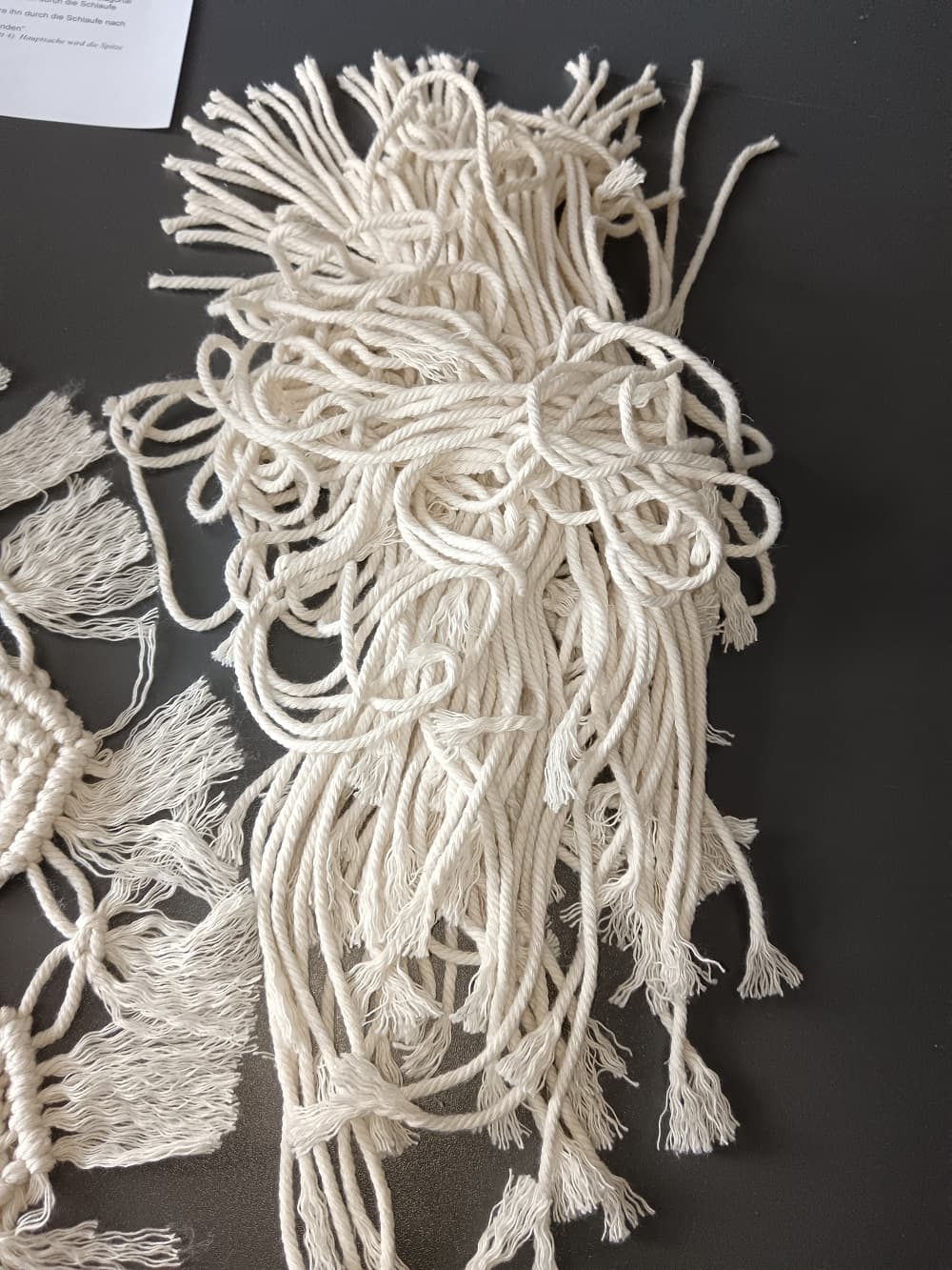 Ich liebe eigentlich Makramees knüpft, aber mein innerer Monk, der so Material sparend wie möglich sein will, weint jedes mal. Was beim aktuellen Projekt übrigblieb und nicht so einfach weiter genutzt werden kann.