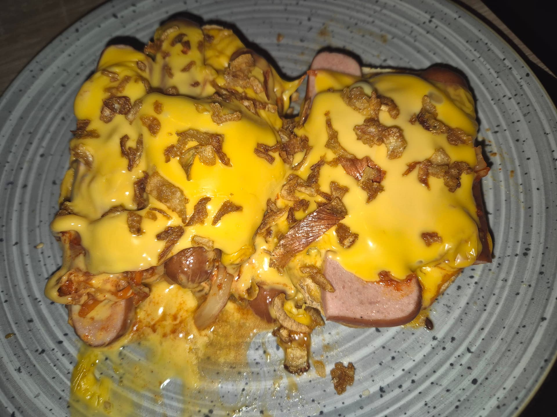 Brötchen mit Chili-Cheese-Sauce, Wiener, Kimchi, Scheibletten"Käse" und Röstzwiebeln.