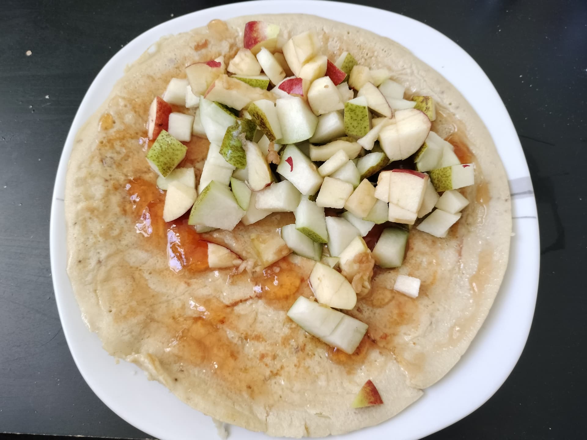 Pfannkuchen mit etwas Proteinpulver und geriebenen Äpfeln im Teig, dazu Apfel, Birne und Quittengelee