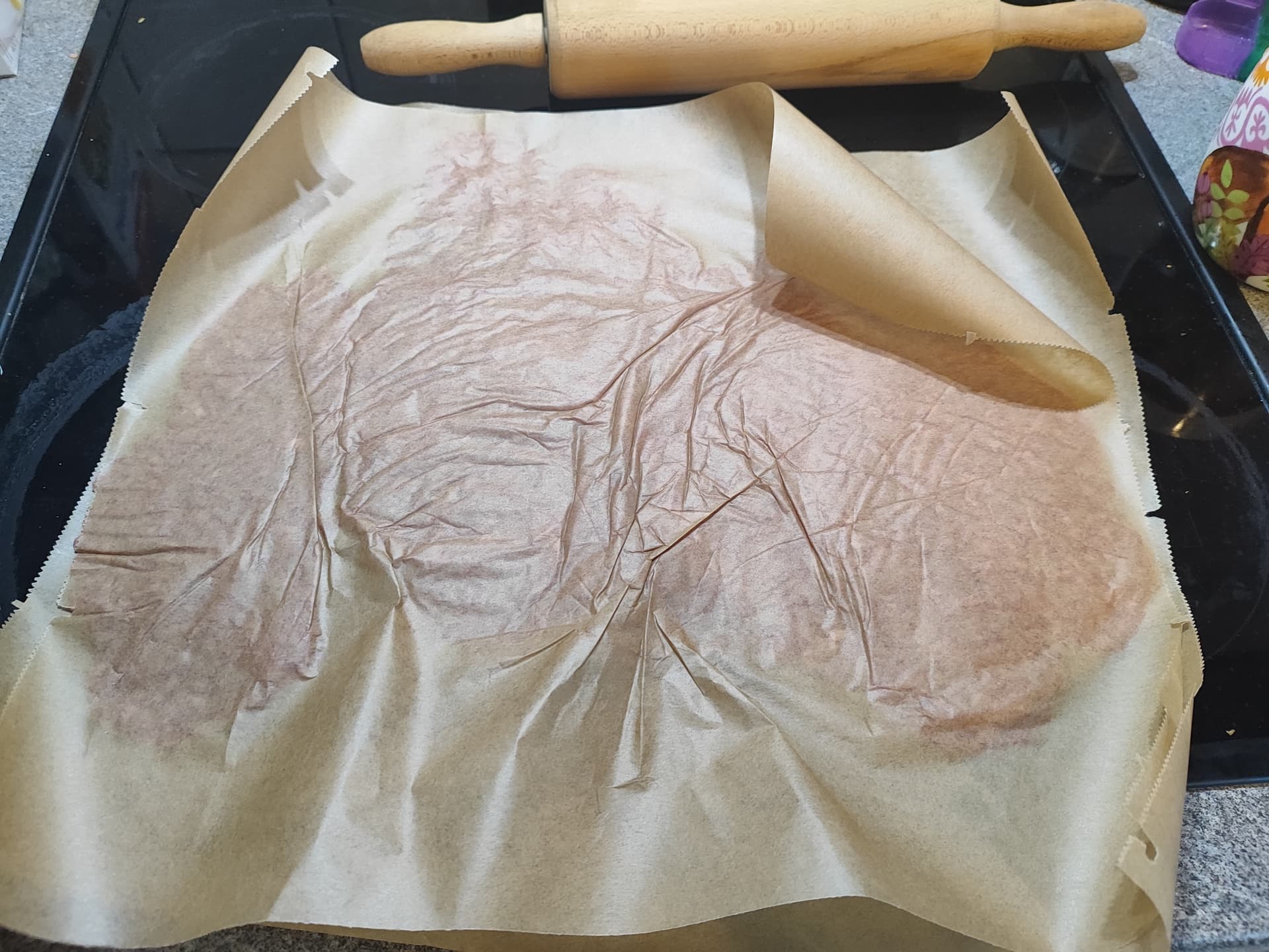 Der Teig ist in Backpapier eingerollt. Dabei klebt beides stellenweise so stark zusammen, dass es beim Ausrollen riesige Löcher ins Backpapier reißt. Teilweise bleiben Fetzen des Papiers am Teig kleben, was man aufgrund der hellen Farben nicht soooo gut sieht. Bin mal gespannt, wie viel Papier ich mir nachher beim Kauen aus dem Mund puhlen muss…