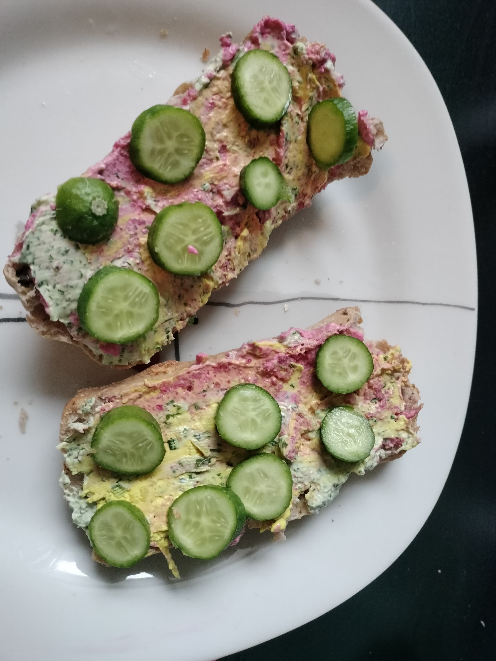 Walnussbrötchen mit Pasten vom Markt (Rote Bete, Artischocke, Rucola), sowie Minigurke