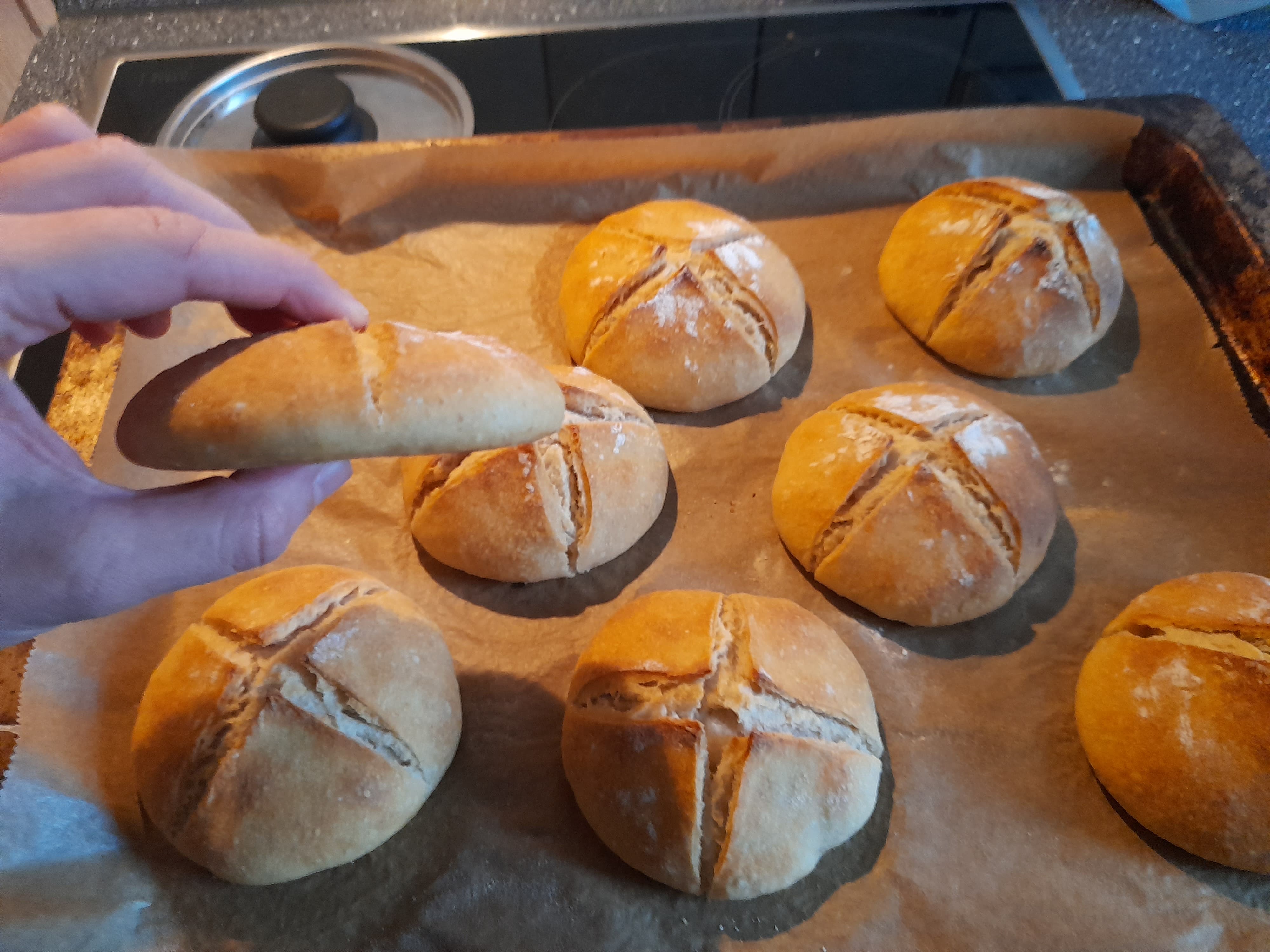 Das Spannende an dieser Sauerteigbrötchenbackerei ist, dass die wirklich jedes Mal ein bisschen anders gelingen. Diesmal sind meine Hübschlinge leider eher Flachlinge geworden. Lecker sind sie trotzdem. (Behaupte ich dreist, ohne schon eines gegessen zu haben. Im Zweifelsfall muss ich das in ca 10 Minuten widerrufen