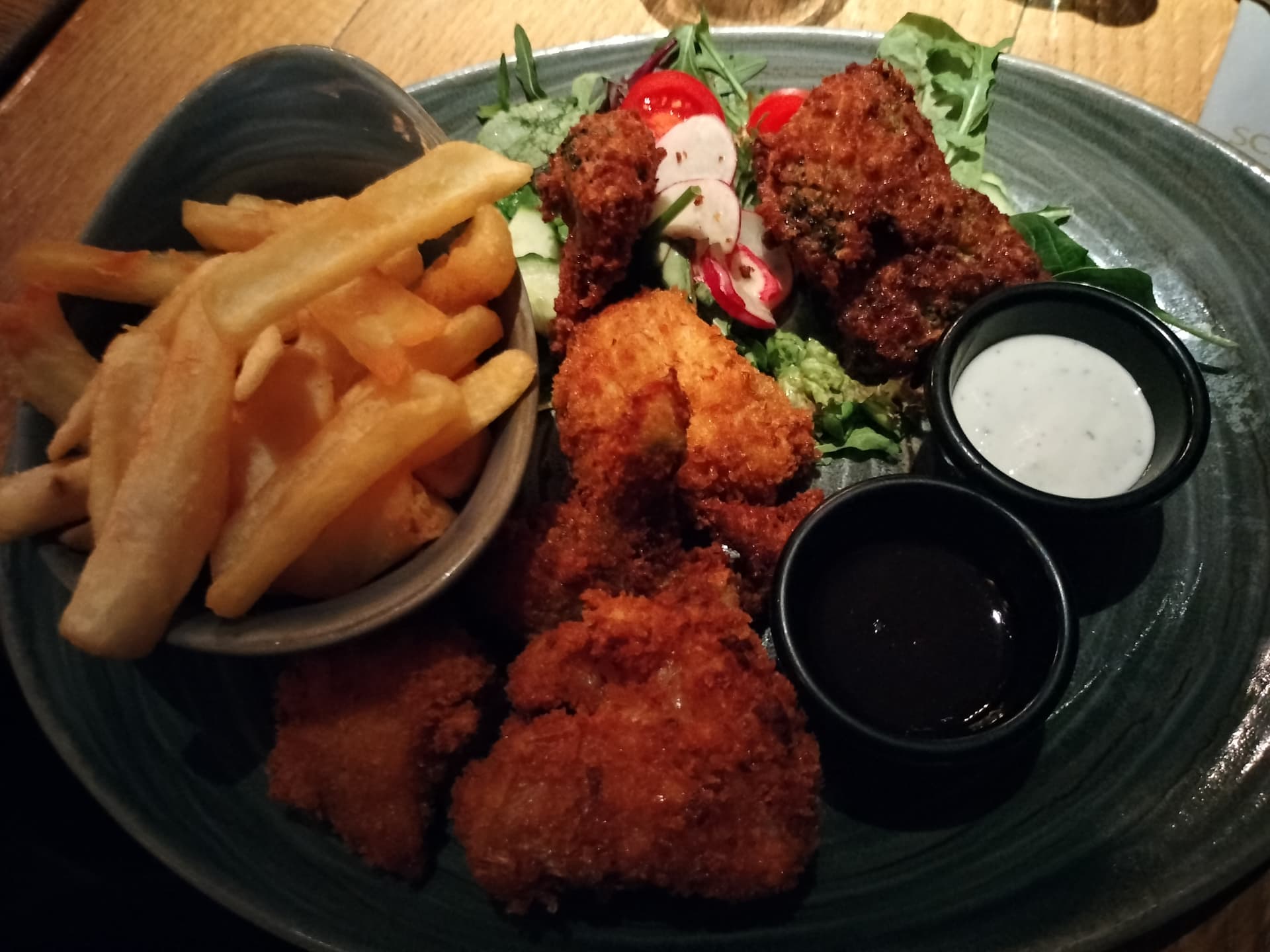 Mit Pankow frittierter Blumenkohl und Brokkoli mit Pommes und Salat, dazu typisch indische Joghurt- und Tamarinden-Dips