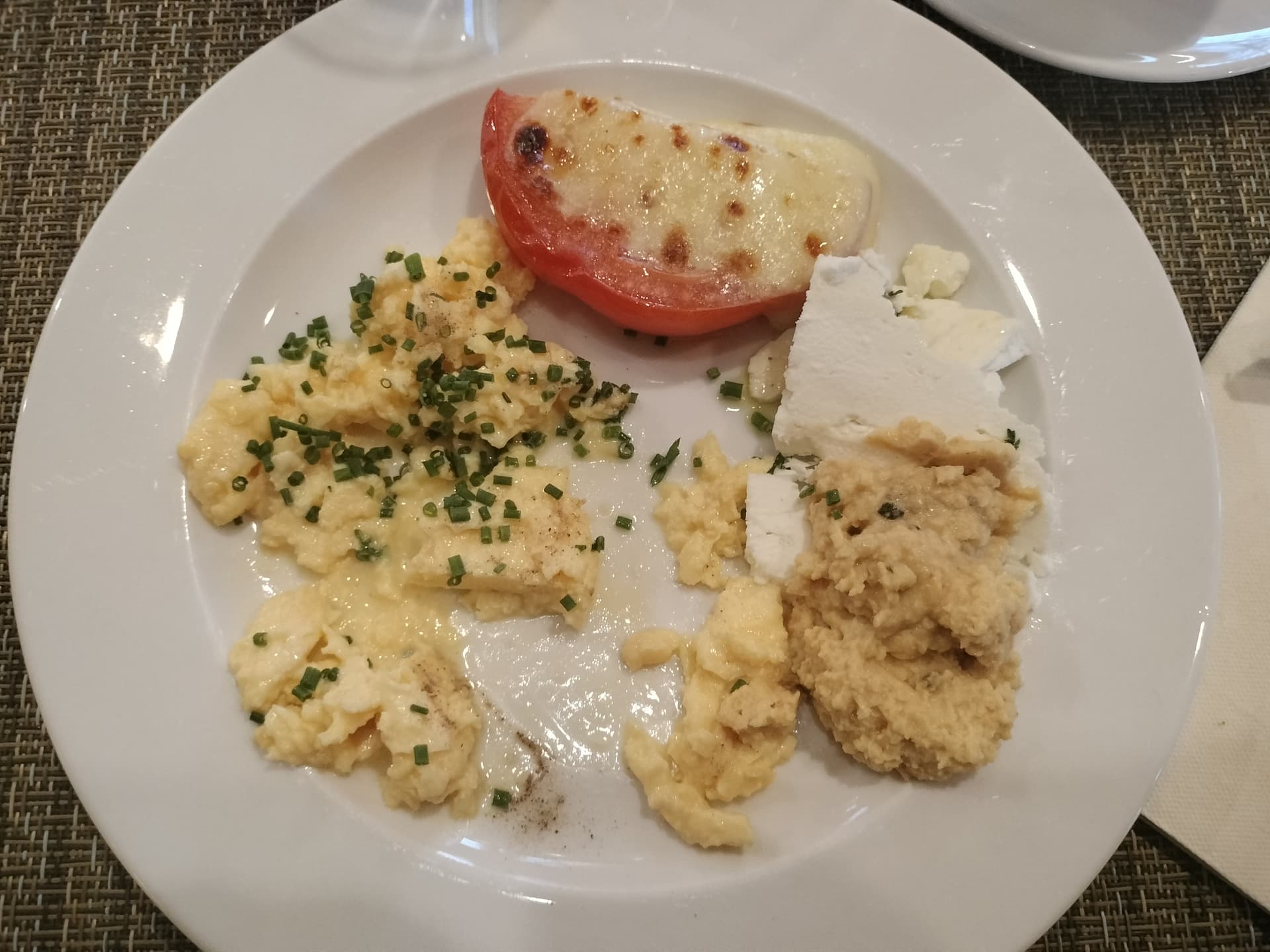Rührei, mit Käse überbackene Tomate, Hummus und Feta mit Oliven