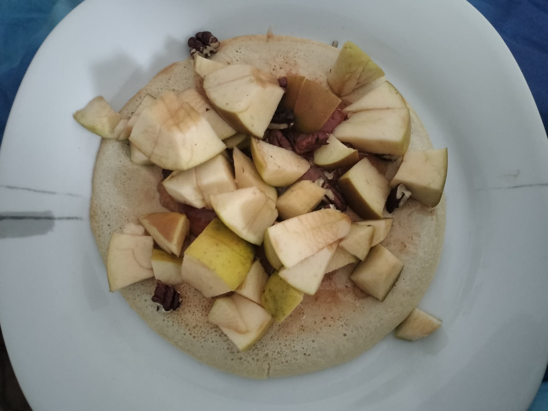 Pfannkuchen mit Proteinpulver, getoppt mit Apfel, Pekanüssen und Quittengelee