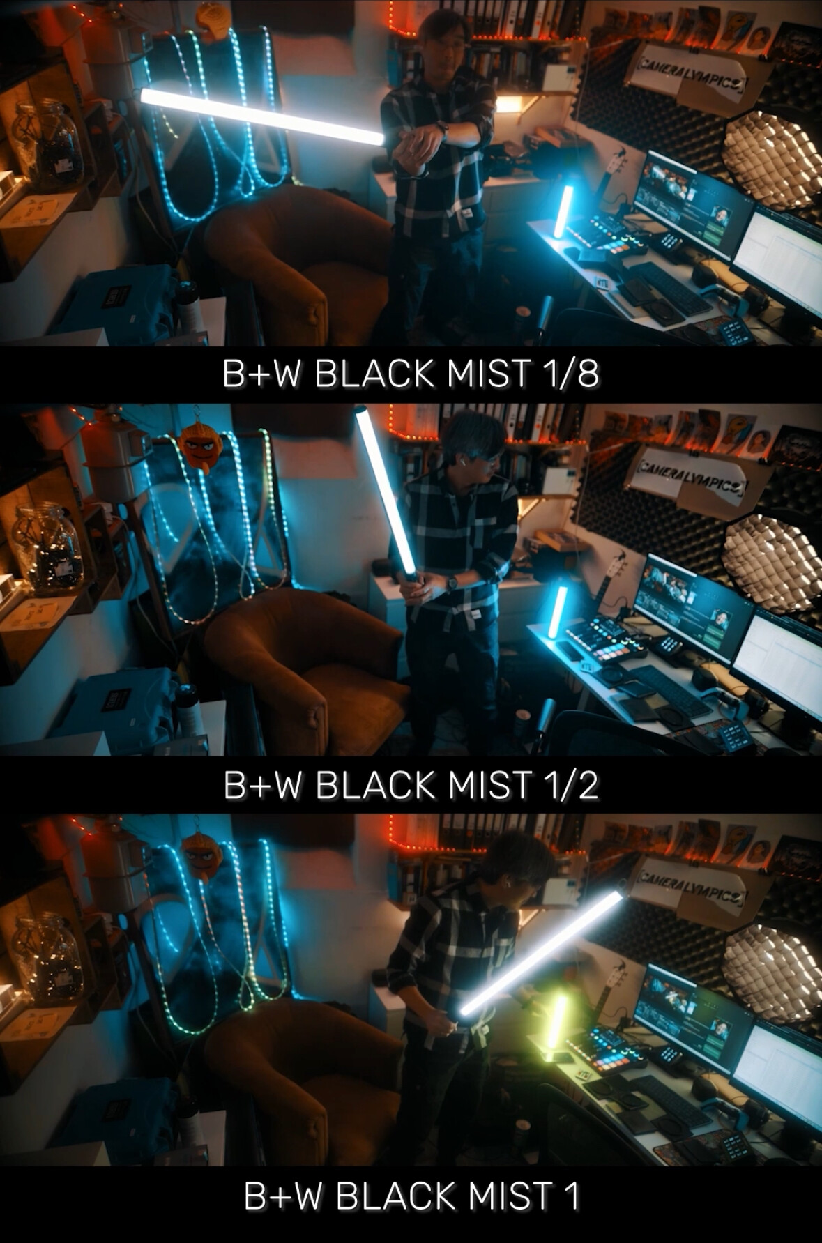 Der White Mist lässt die Lichtquelle noch sichtbar, der Black Mist geht einfach drüber (bedenke allerdings: es sind andere Stärken)