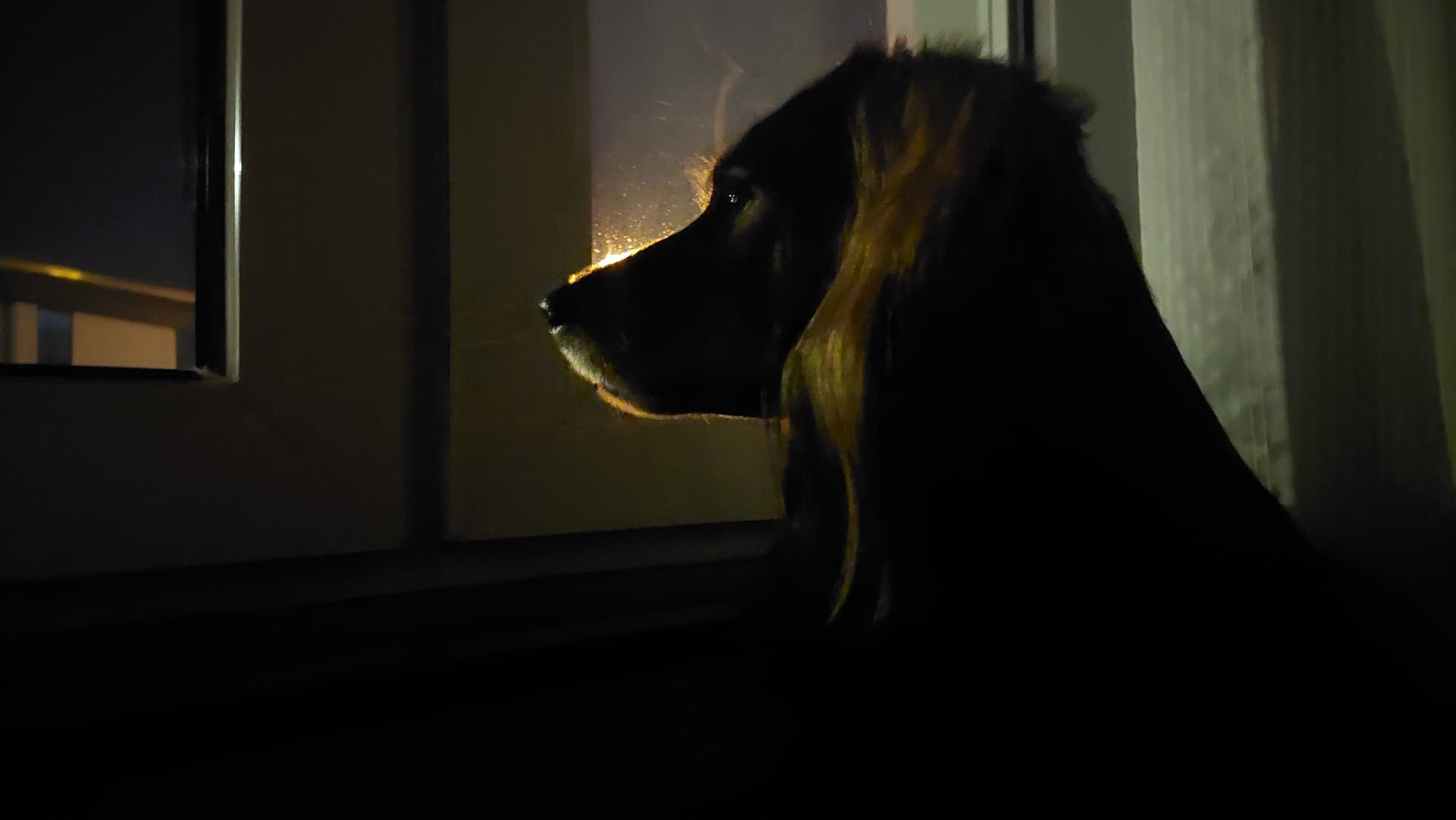 Dackel sitzt am Fenster und findet es total geil, dass da soviel Trubel ist. Die andere liegt zitternd unter der Bettdecke und hasst es.