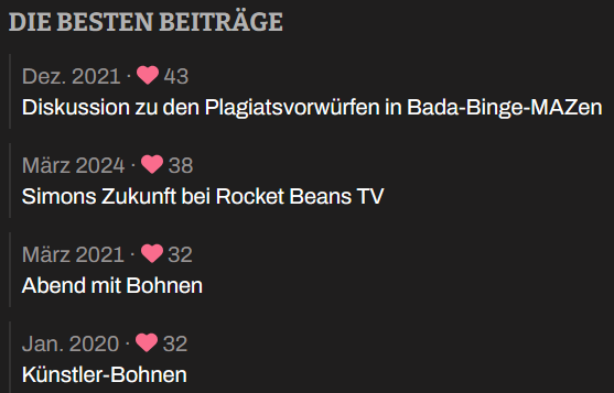2.) In der Account-Übersicht werden in der Liste der „Besten Beiträge“ nur die Herzchen gezählt. Wäre es nicht sinnvoll, die anderen Emotes ebenso zu beachten und alle Emotes zu addieren?