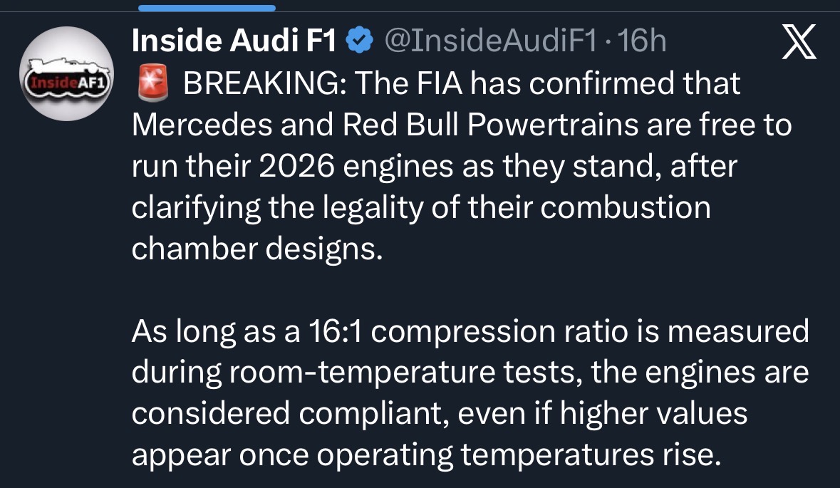 Ich denke nicht das die FIA da noch irgendwas für 2026 macht, ähnlich wie beim DAS, wird man das 2026 laufen lassen und zu 27 muss die PU angepasst werden…