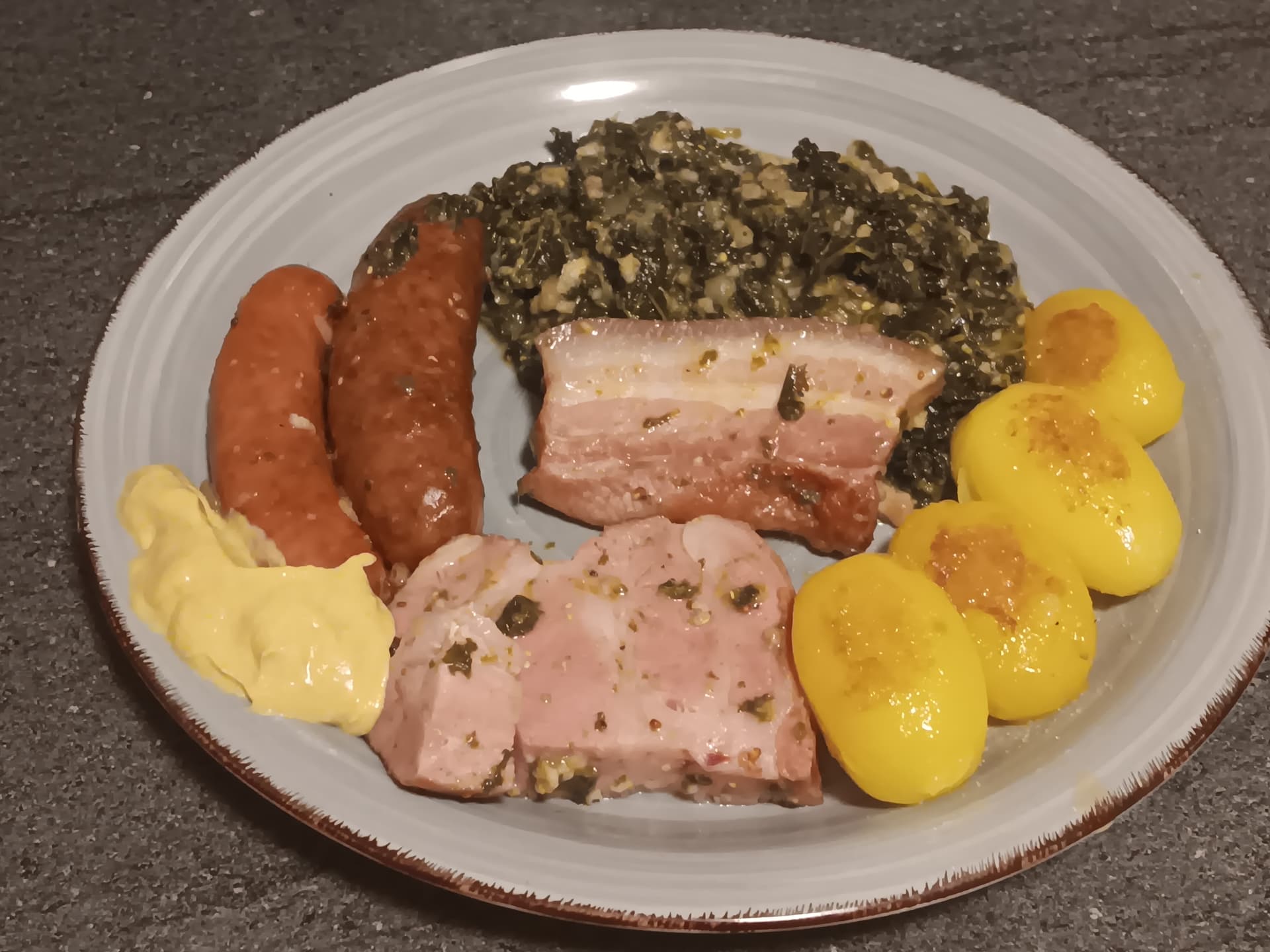 Fleischeinlage rausfischen und Grünkohl mit Salz, Pfeffer und Senf abschmecken (ich hab diesmal ne Mischung aus Bautzener und Grobkörnigen genommen (den hatte ich noch da von nem Anderen Rezept.