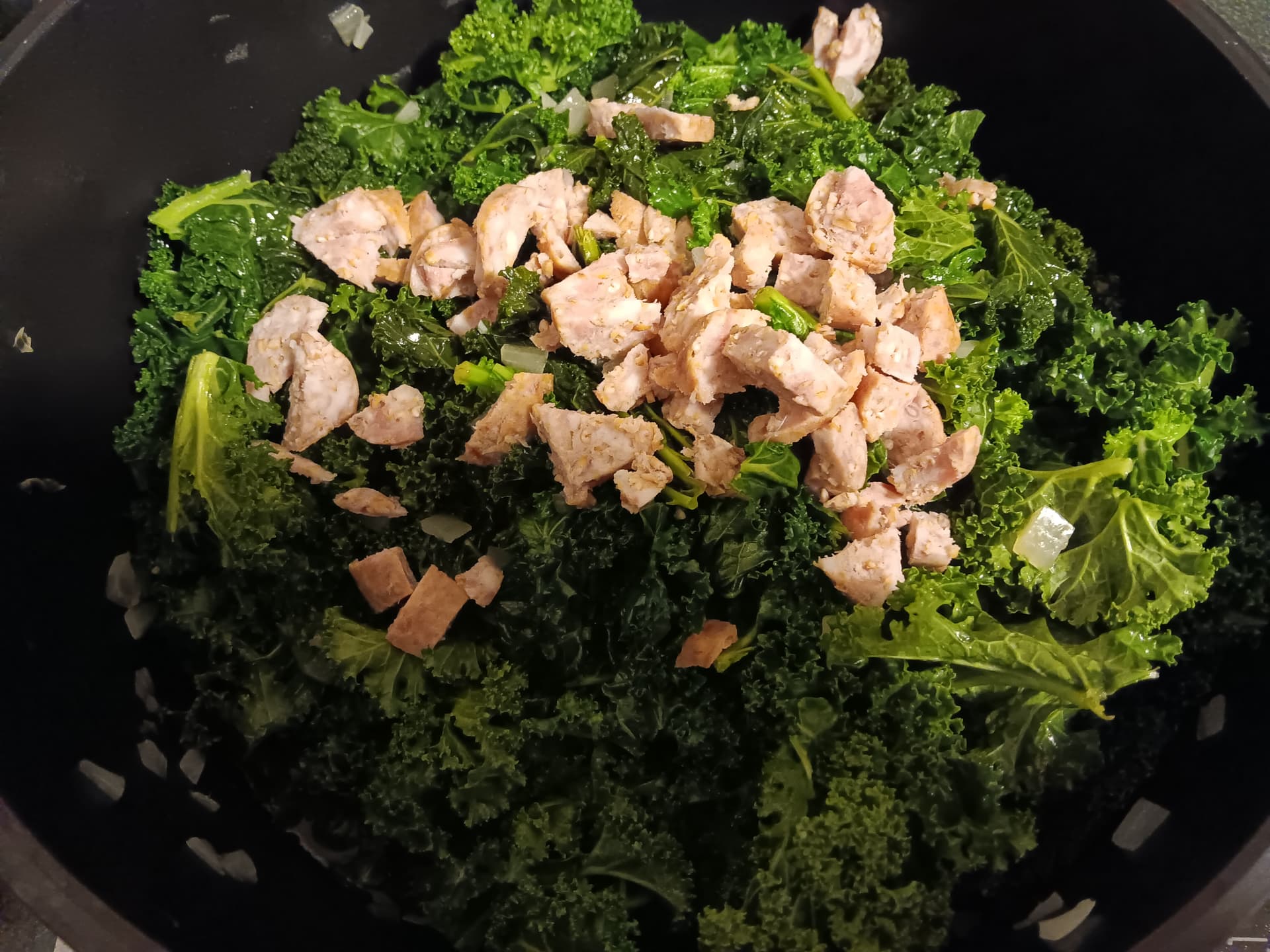 Grünkohl von den dicken Stängeln befreien, eine Pinkel häuten und kleinschneiden.