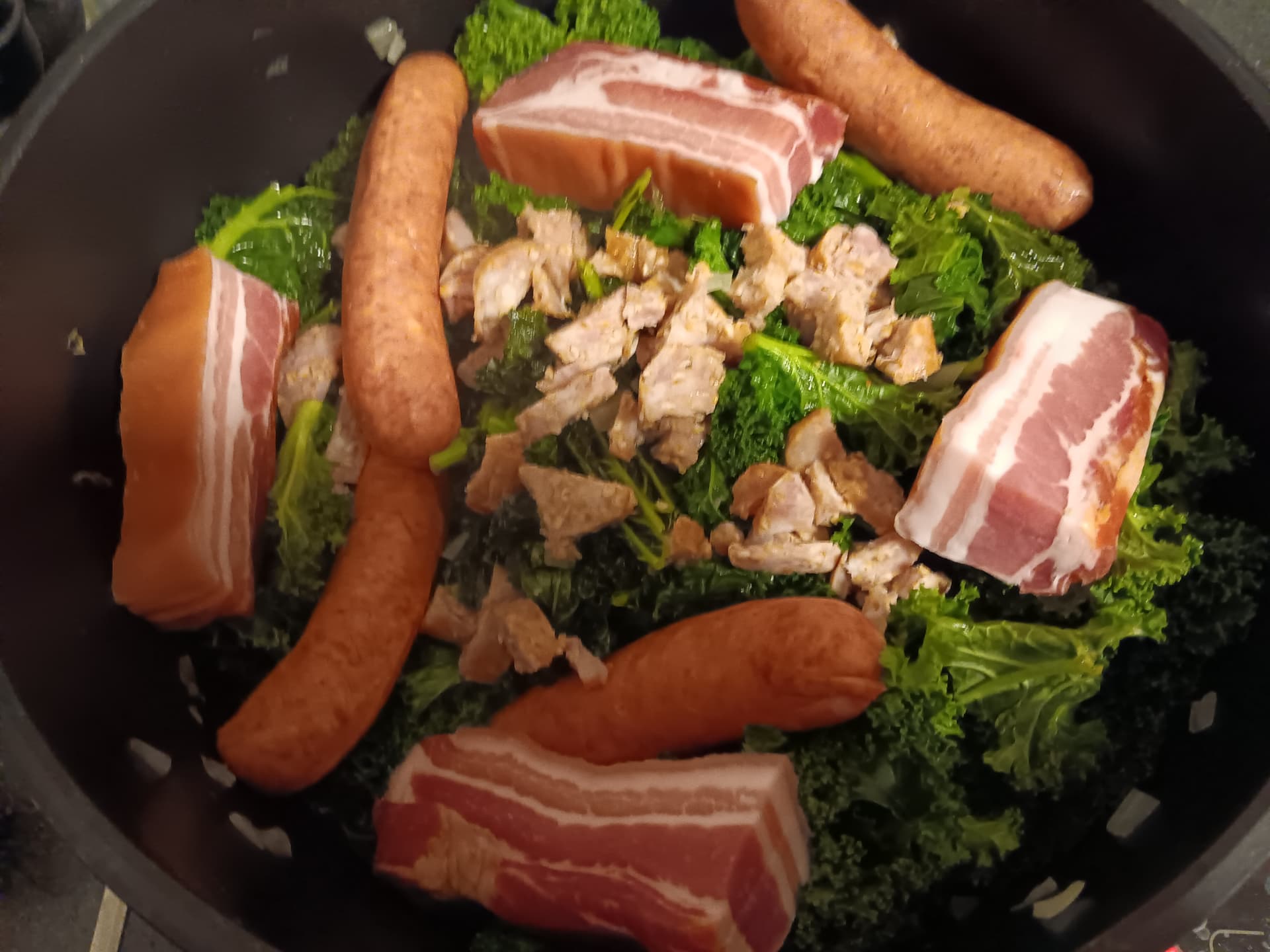 dann die Brühe und Kohl dazu, dann Speck und angestochene Mettenden.