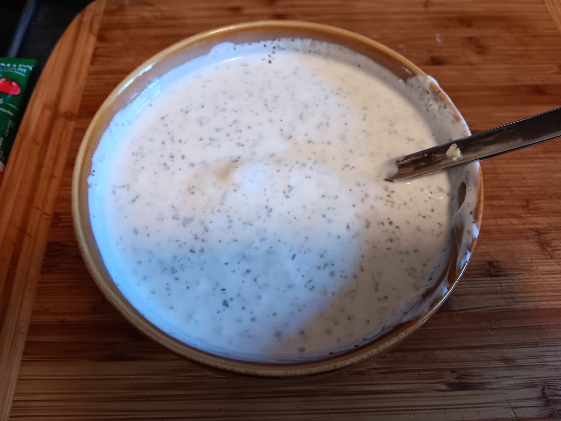 in der Zeit bis die Pfanne Heiß und das Wasser am Kochen ist Jogurt in eine Schüssel und Minze, Sumak, gepressten Knoblauch und Salz dazu, gut rühren. Zur Seite stellen.