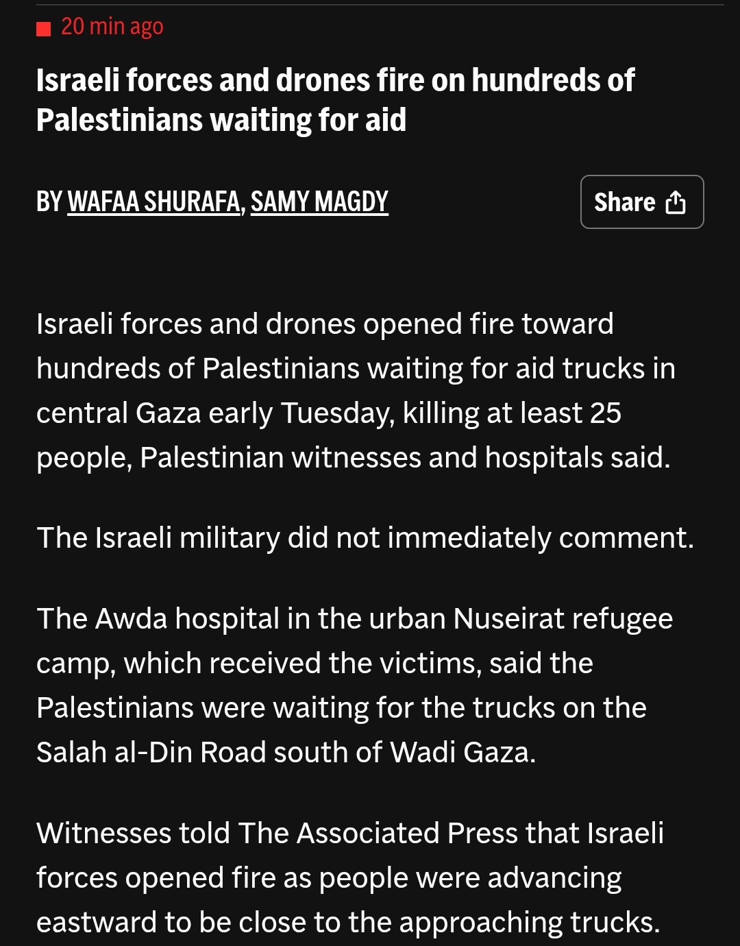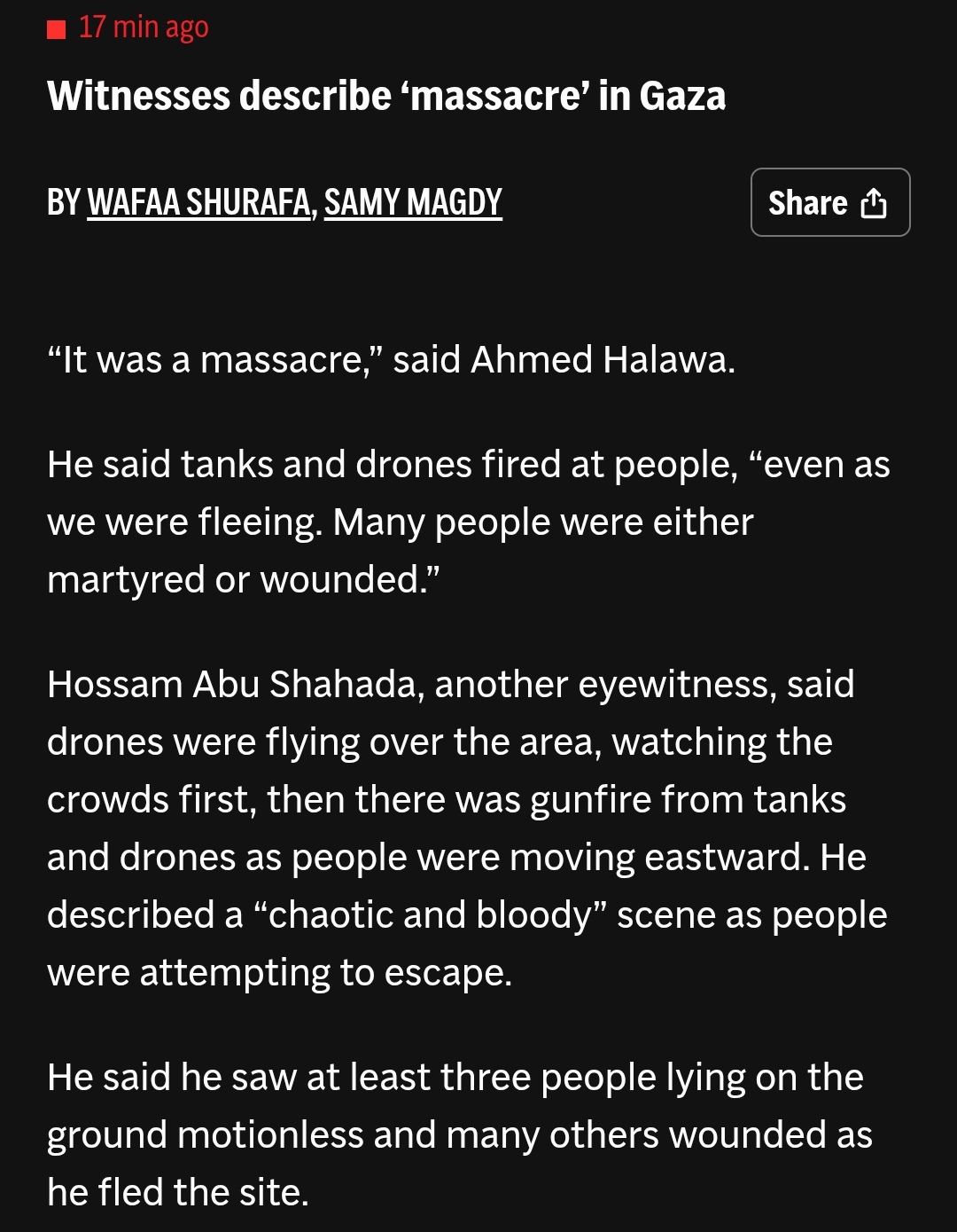 und noch mal zur Erinnerung, dass diese Massaker erst in diesem Ausmaß und Regelmäßigkeit passieren, seit die „Gaza Humanitarian Foundation“ die Kontrolle über die Verteilung von Hilfsgütern übernommen haben. Ein US-Unternehmen das die volle Unterstützung von Trump und Netanyahu genießt und von vielen Menschenrechtsorganisationen und der UN kritisiert wird.