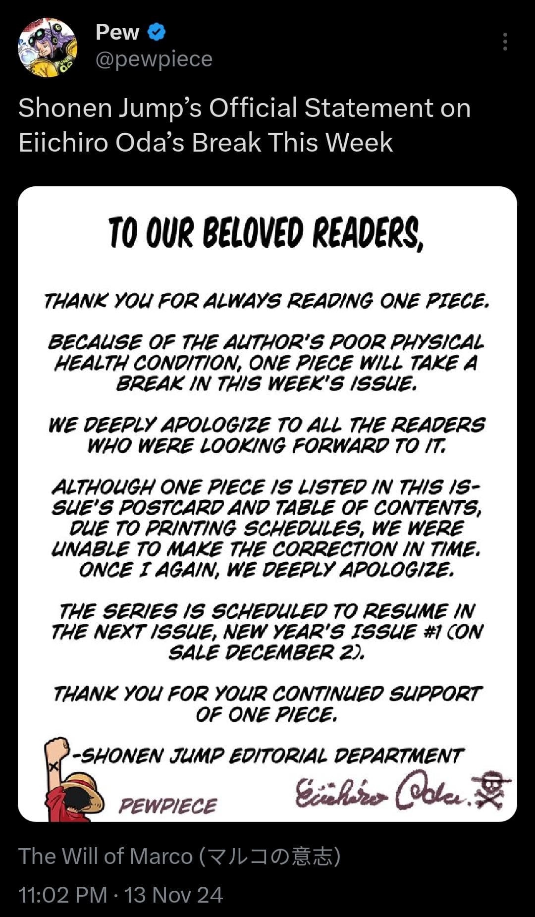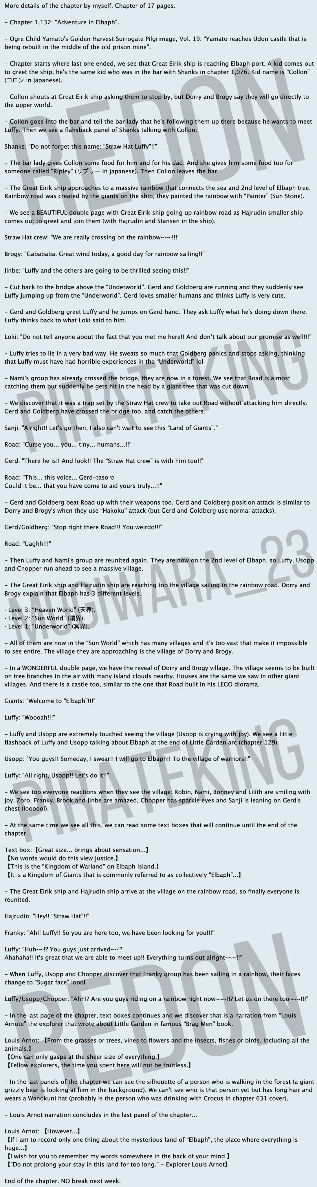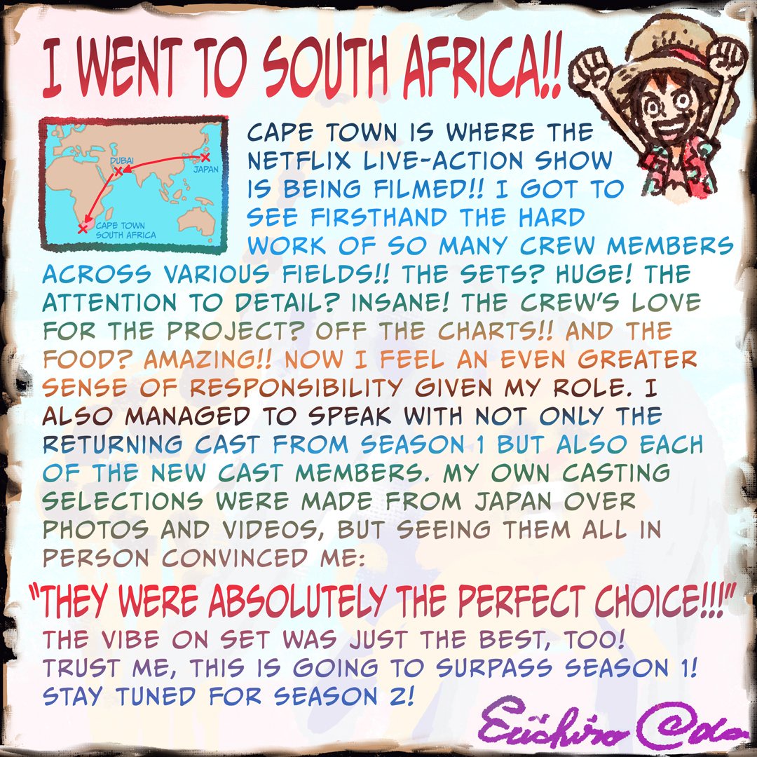 Oda soll übrigens auch noch eine persönliche Botschaft beigefügt haben, in der er sich entschuldigt das es doch wieder eine längere Pause gab, obwohl er es anders angekündigt hatte. Er verspricht nun wieder mit vollem Tatendrang an die Arbeit zu gehen.