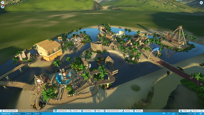 Hab mich in PlanetCoaster mal an einem Karibik/Piraten Theme ausprobiert und das nach 2-3 Stunden nun so aus, gefühlt habe ich allein 2 Stunden damit verbracht Bäume,Pflanzen und Steine zu platzieren :