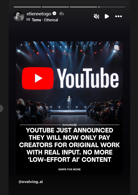 AI Content wird weiterhin auf Youtube erlaubt sein, aber es wird ab dem 15. Juli nicht mehr monetarisierbar sein. Simons Show ist also nicht zukunftsfähig (auf Youtube) sofern er an den AI Inhalten festhält.