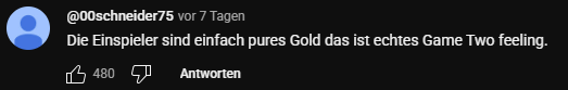 Joah… Aber kann man schon sagen. Zumindest dann, wenn sich der Kommentar auf ein aktuelles Video bezieht. Es ist ja immerhin Game two point five oder so. Von daher ist das schon ein Lob, dass das kleinere Team jetzt immer noch „echtes Game Two feeling“ hinbekommt.