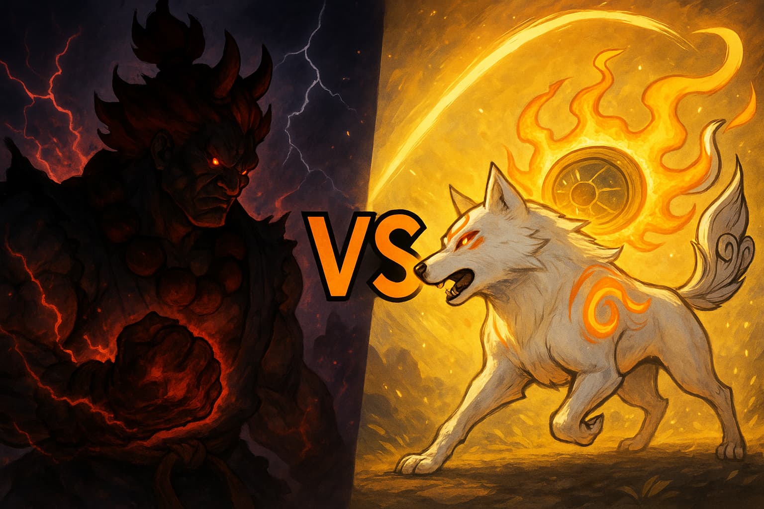 Ort: Ein halb zerstörtes urbanes Gebiet bei Nacht – verlassene Lagerhallen, brennende Fahrzeuge, Rauch, viele textile Materialien (Zelte, Kleidung, Planen) und Lüftungsschächte – ideal für beide Kämpfer.