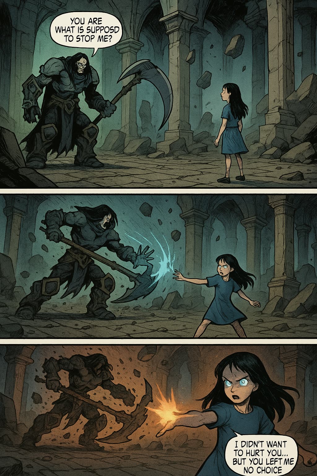 Mit einem mächtigen Schrei beschwört er dunkle Energie und rast auf Matilda zu.