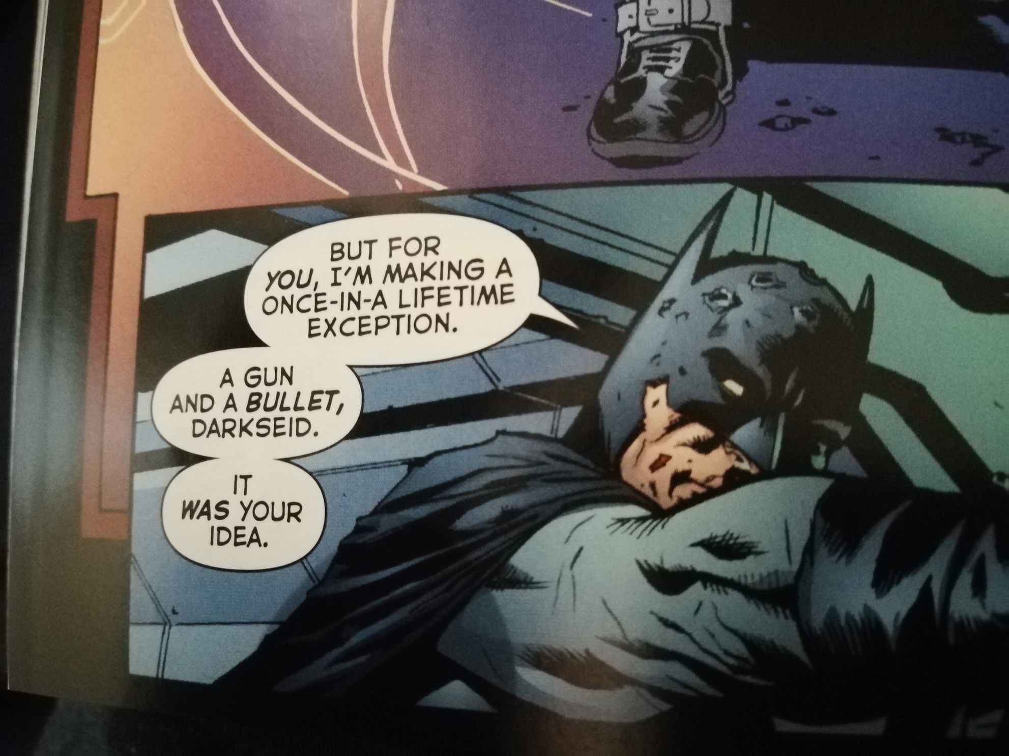 Der springende Punkt bei Batman vs. Superman ist jedoch das er durch den Tod von Robin(Jason?) durch den Joker, seine Grundideale überdenkt und auch zu Schusswaffen greift.